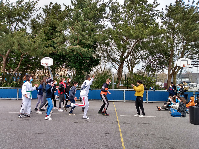 Du lundi 29 mars au mercredi 7 avril, l’équipe artistique travaillera à la création de son spectacle pour l’espace public On est là ! Tout va bien au sein collège. Cette résidence de création, fait suite à une semaine d’ateliers pratique artistique menée par l’équipe artistique avec le niveau de 5e. Deux classes ont poursuivi leur initiation au trapèze et à la philosophie, épaulées par Carla Farreny (trapèze) et Aurélie Armellini (philosophie), alors que deux autres classes se sont mises en mouvement en créant de véritables chorégraphies de « la joie », le thème principal de la future création.