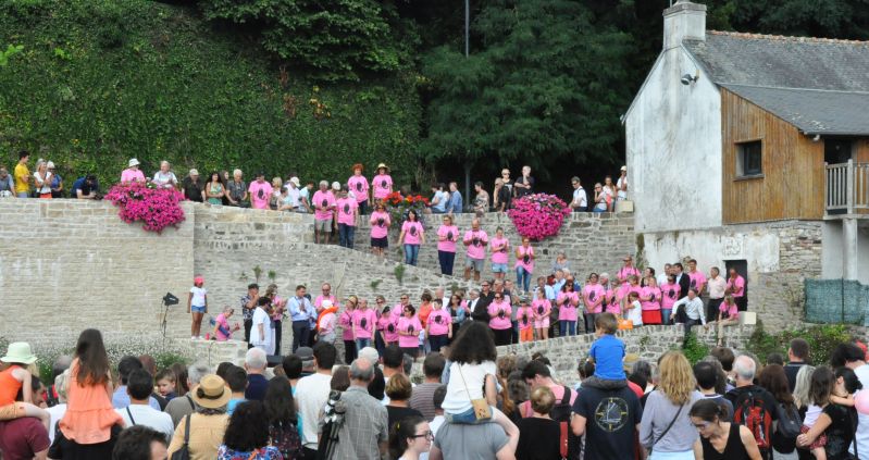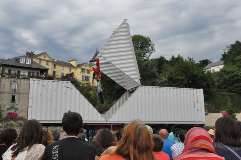 Ils ont traversé ensemble, avec les élus de Quimperlé Communauté et la direction du Fourneau, la rivière Isole pour aller faire retentir le traditionnel gong de départ dans un panneau sens interdit et ainsi ouvrir cette 8ème édition du festival. Ce coup de gong a étrangement déclenché l’arrivée d’un semi-remorque, celui de la Compagnie Furinkai. Surprise de cet acte inaugrual, à 13h13, sous le ciel orageux, le container d’Origami s’est ouvert...