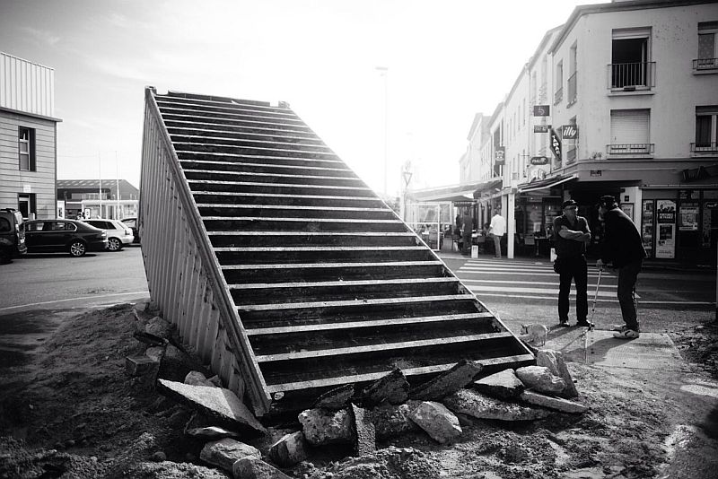 "En ce matin bien embrumé, je n’avais pas l’intention de rejoindre le Portde : c’est samedi et c’est jour chômé. Et chaque samedi je me rends en centre ville à bord du tram qui un jour, avec des milliers de Brestoises et de Brestois m’a fait danser.J’attendais mon tram de 9H33 à l’arrêt Strasbourg quand j’ai entendu dans mon dos un énorme bruit. Sous mes yeux ébahis une demi douzaine de containers venait de s’écraser comme tombés du ciel à travers les nuages. "