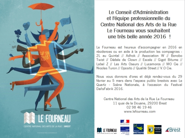 Le Conseil d’Administration et l’équipe professionnelle du Centre National des Arts de la Rue Le Fourneau vous souhaitent une très belle année 2016 !
