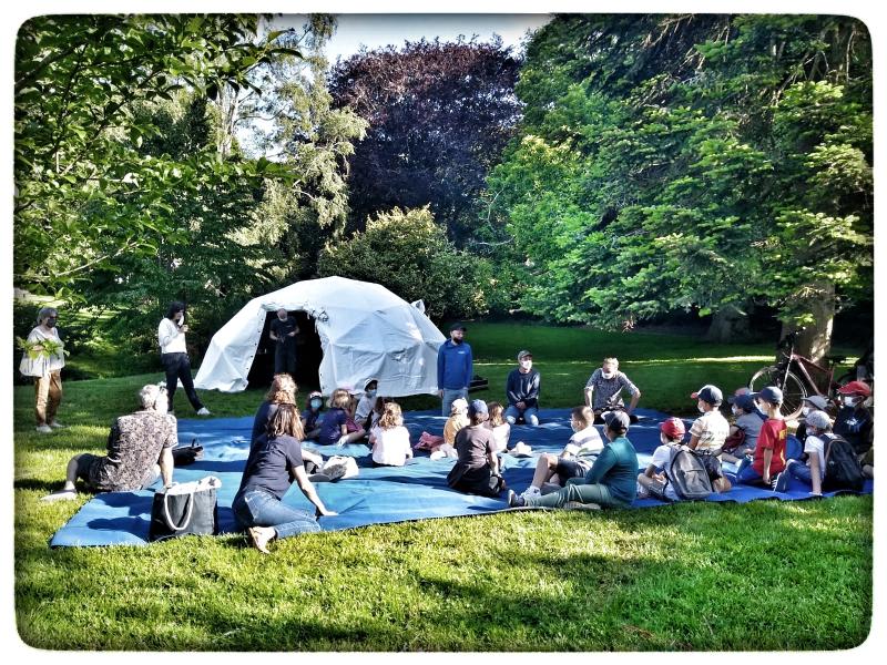 Dans le cadre verdoyant du jardin Yves Jaouen à Saint-Marc, une classe de CP/CE1 de l’école publique du Forestou et une classe de CM1/CM2 de l’école publique de Kerbernard participent à des ateliers théâtre et musique autour de la vie des Inuits au Pôle Nord.
