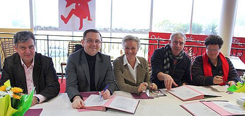 De gauche à droite sur la photo : Jacques JULOUX, Vice Président culture de la COCOPAQ, Nicolas MORVAN, Président de la Communauté de Communes du Pays de Quimperlé, Murielle BIGARD, propriétaire du Centre Leclerc de Quimperlé, Claude MORIZUR et Michèle BOSSEUR , co-directeurs du Centre National des Arts de la Rue Le Fourneau.