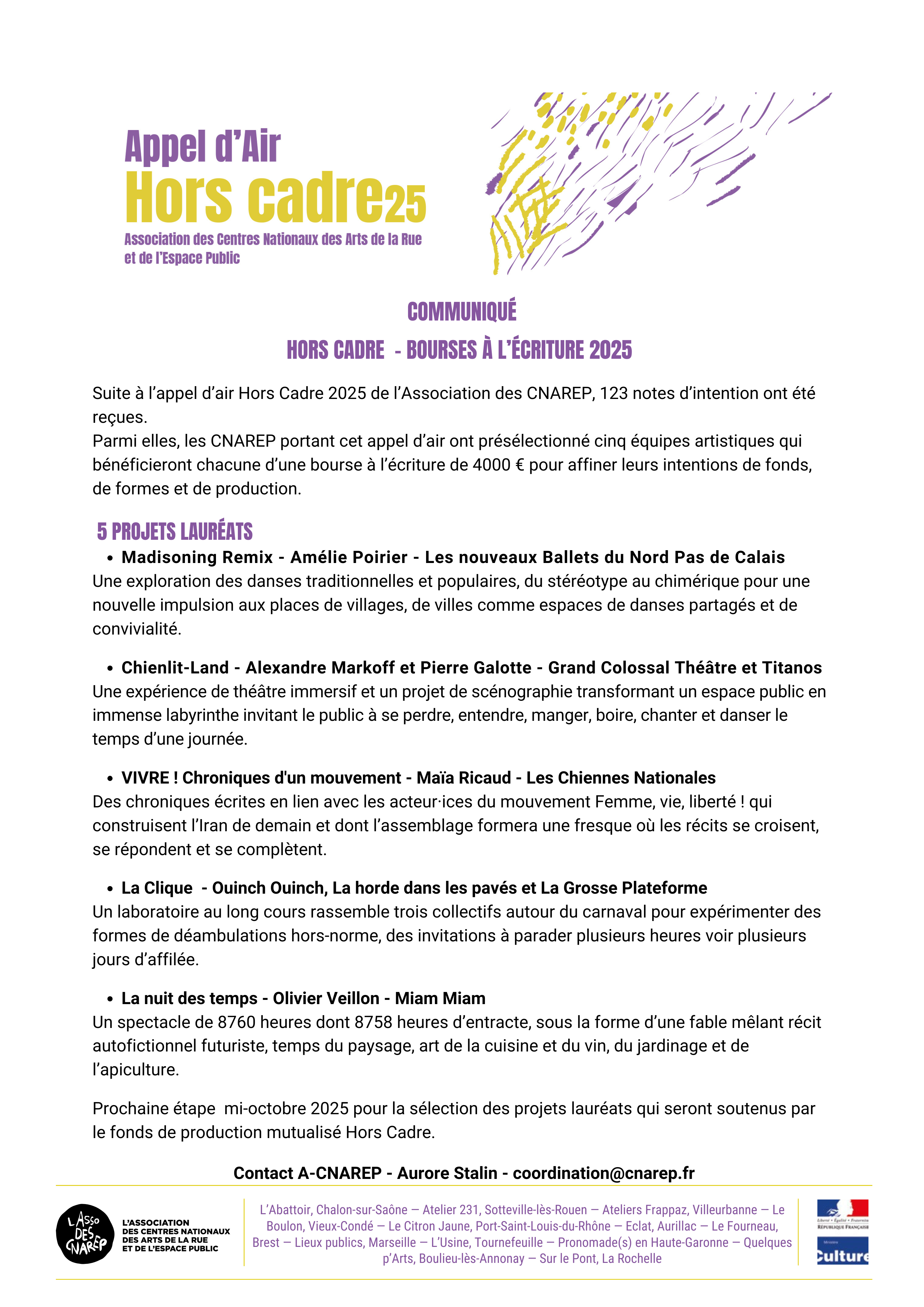 Suite à l’appel d’air Hors Cadre 2025 de l’Association des CNAREP, 123 notes d’intention ont été reçues. Parmi elles, les CNAREP portant cet appel d’air ont présélectionné cinq équipes artistiques qui bénéficieront chacune d’une bourse à l’écriture de 4 000 € pour affiner leurs intentions de fonds, de formes et de production.