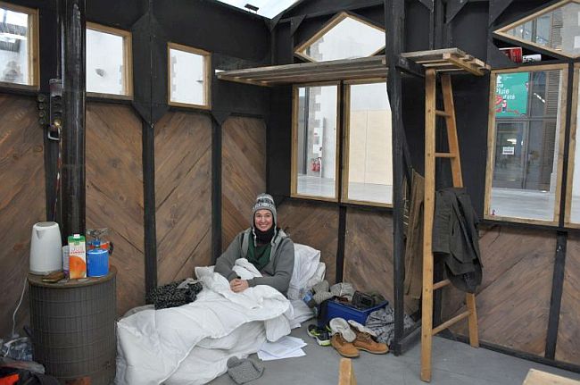 Une cabane, meublée de deux lits, d’une table, d’un poêle et de bancs. C’est ici que les artistes passent la semaine, en habitant la Place des Machines, pour laisser la porte ouverte au hasard et aux rencontres avec les brestois-es.