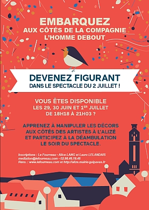 Ils ont embarqué aux côtés de la compagnie l’Homme debout ! ils ont appris à manipuler les décors aux côtés des artistes afin de participer à la déambulation le soir du spectacle. Les répétitions avaient lieu les soirées des 29, 30 juin et 1er juillet de 18h18 à 21h03 à l’Alizé (2 répétitions nécessaires dont le 1er juillet indispensable). Inscriptions auprès de Alice Lang et Laura Lelandais : mediation@lefourneau.com - 02 98 46 19 46.