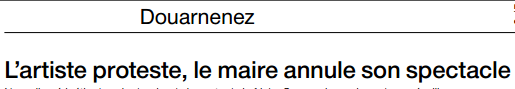 Mais en ce début 2017, la diversité des paroles et des points de vues n’aurait elle plus sa place en certaines terres bretonnes ? Les artistes devraient ils adhérer à tout point de vue à la vision de la municipalité pour avoir le droit de travailler et de créer dans leur ville ? Afin que la triste histoire du Maire qui annule une commande publique à un artiste qui dérange ne se renouvelle pas, il est de notre devoir républicain d’exprimer notre soutien à Ronan Le Fur et au Collectif douarneniste Banannée 2017.