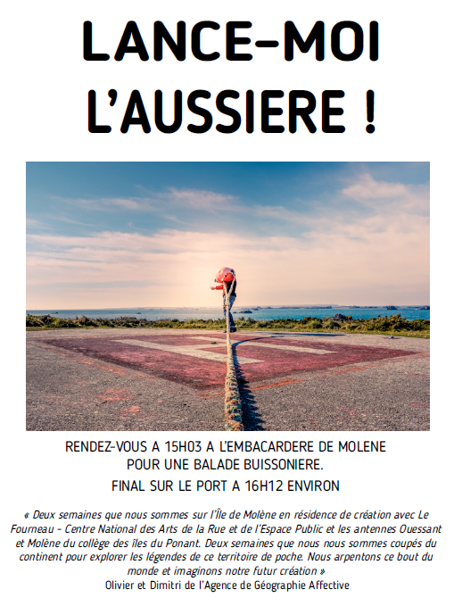 Après deux semaines de résidence sur l’île Molène, l’Agence de Géographie Affective présentera une étape de travail de ses recherches menées à Molène pour la création de Légendes (titre provisoire). Le rendez-vous est fixé à l’embarcadère samedi 14 avril 2018 à 15h03 pour une déambulation dans l’île.