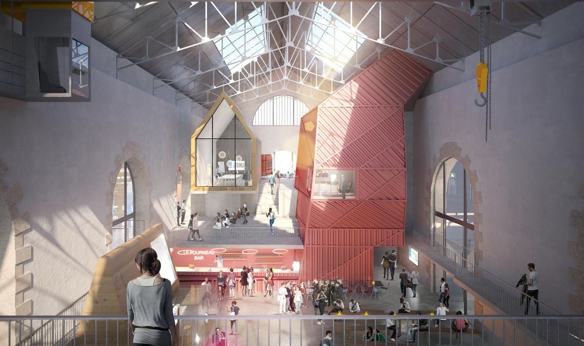– Un espace d’introduction et de convivialité "Bonjour-Bonsoir" permettant d’ouvrir largement le lieu sur l’extérieur et qui intègre un espace de restauration nommé La Gueule d’Or pour les équipes accueillies ;