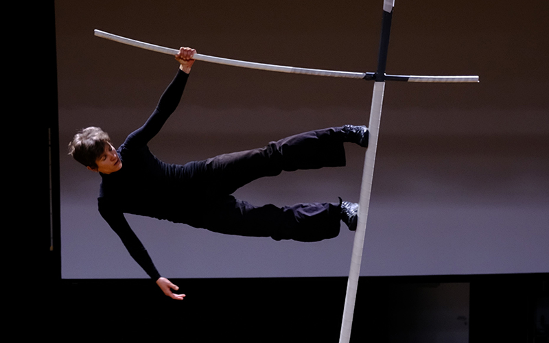 En solo à 6 mètres du sol, sur une structure-sculpture, fragment d’idéogramme, Fanny Austry hybride le calme évanescent de la suspension avec des dynamiques saccadées issues du krump.