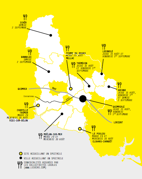J-2 pour le festival Les Rias ! Si ce n’est pas encore fait, il est grand temps de préparer votre itinéraire artistique au fil de l’eau, afin de savoir combien de kilomètres séparent Arzano de Bannalec, combien de temps il vous faudra pour rallier, en voiture, en vélo ou en trottinette, Mellac à Clohars-Carnoët, ou encore décider si vous mangez plutôt à Tréméven ou à Quimperlé !