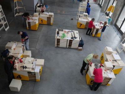 Les ateliers de fabrication du Grand Jeu se sont achevés samedi 17 juin avec 256 pièces en bois au compteur ! Depuis le mois de mars 2017, le collectif brestois d’architectes, paysagistes et designers, Les ManufActeurs a proposé aux habitants de la métropole brestoise d’inventer puis de fabriquer un Grand Jeu pour les Capucins. Les premiers ateliers consacrés à la conception ont amené les embarqués de La Fabrique citoyenne et poétique des Capucins à dessiner, réfléchir aux règles du jeu, choisir les couleurs. Puis les embarqués sont devenus artisans d’un jour au cœur des Ateliers en assemblant les pièces en bois du Grand Jeu ! A présent, 128 pièces fabriquées par ces embarqués vont prendre des couleurs, puisqu’une peintre va apposer sur chacune d’entre elle une forme géométrique colorée.