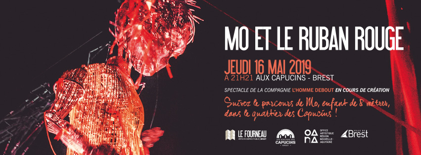 La compagnie l’Homme debout, en résidence au Fourneau du 7 au 18 mai pour son spectacle Mo et le ruban rouge, invite à découvrir cette déambulation géante racontant l’histoire d’un enfant séparé de sa famille, jeudi 16 mai 2019 à 21h21 aux Capucins à Brest.