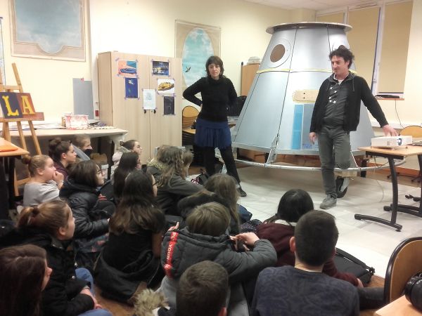 En parallèle, Chtou et Belinda sont avec les classes de 6ème pour des ateliers d’écriture et théâtre autour de scénettes de rencontre entre extraterrestres et habitants de Sizun.