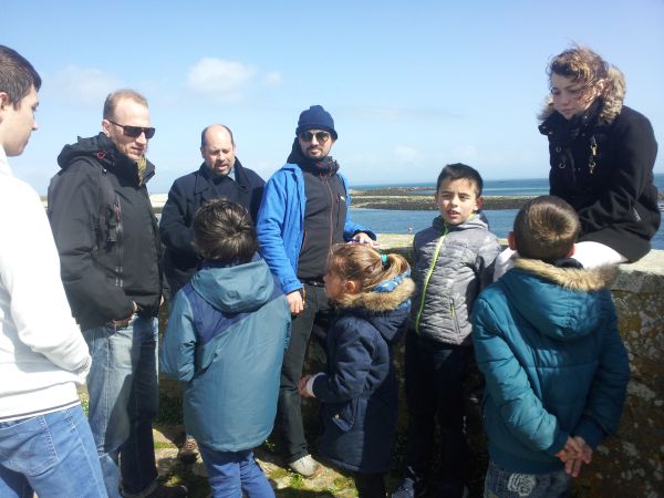 Les artistes Olivier Villanove (conteur) et Dimitri Messu (architecte) sont arrivés lundi 2 avril sur Molène. Mardi, les élèves molénais leur ont fait visiter leur île. Ce mercredi, les 12 élèves de Ouessant débarquent pour deux jours d’ateliers de pratique artistique (écriture, prise de son, art oral) les invitant à mettre en jeu leurs corps et leurs voix dans l’espace public.
