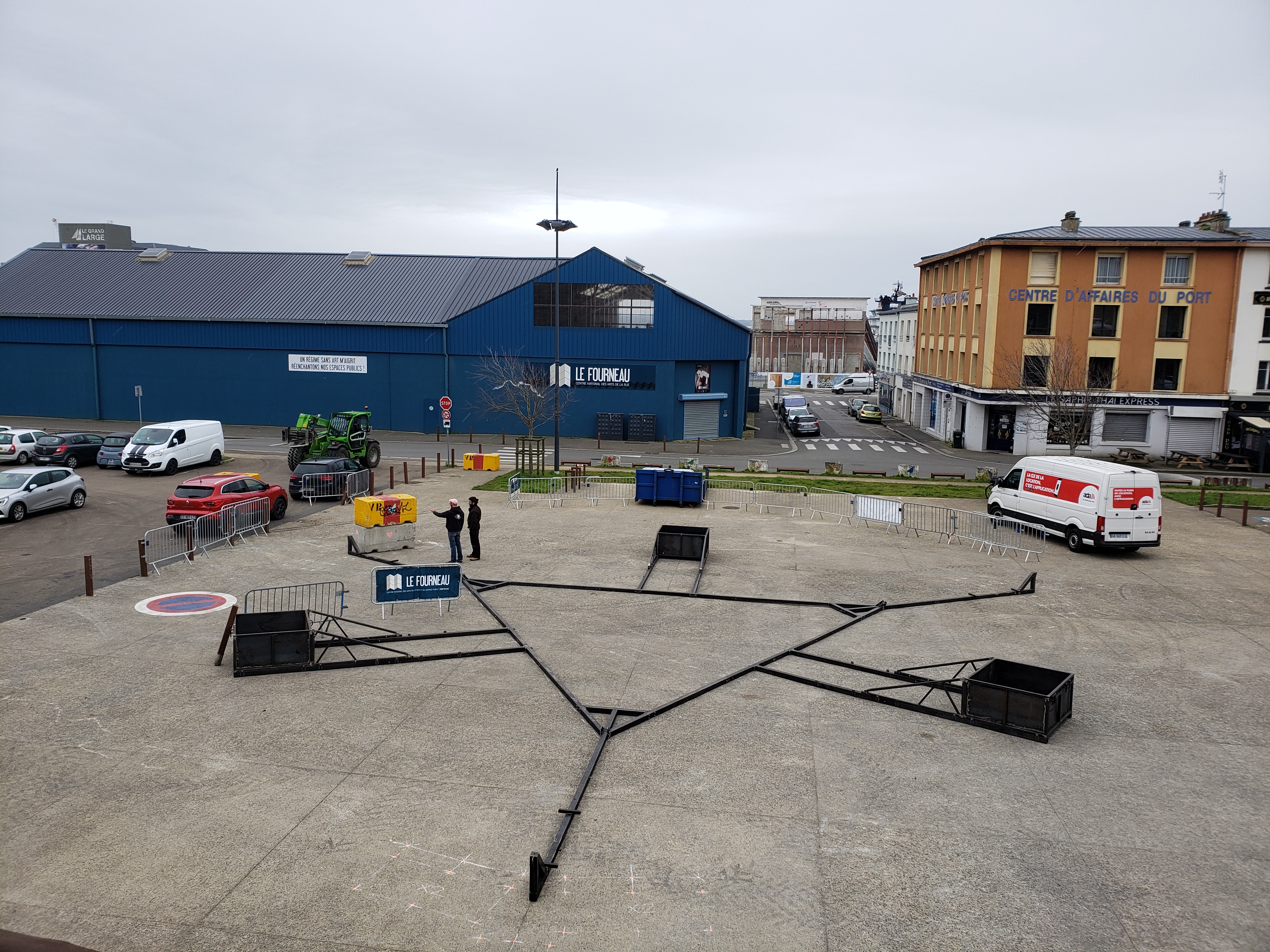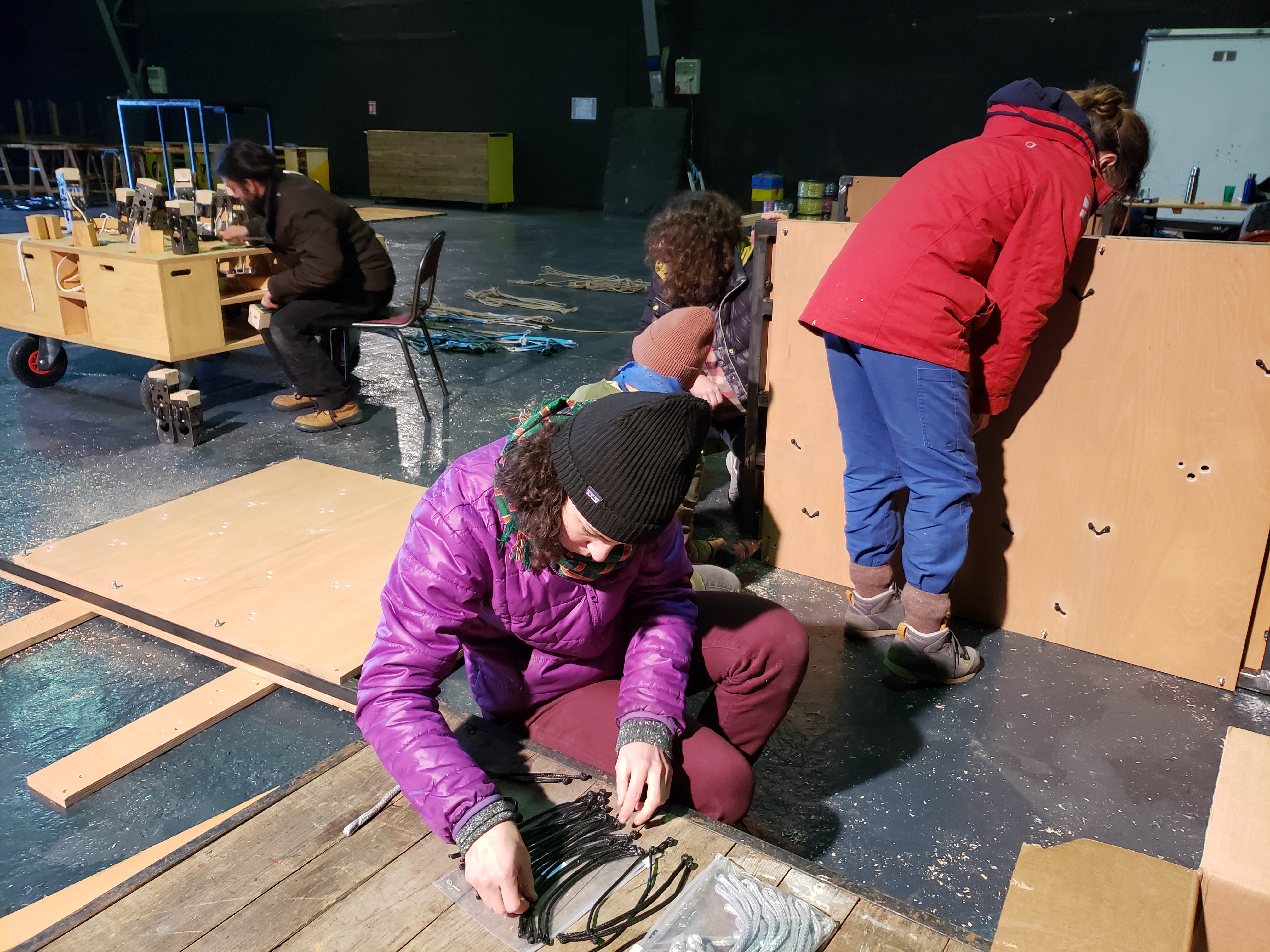 Petit à petit, cordes et poulies sortent du Fourneau direction le Parc à Chaînes où le montage de la structure a lieu. À partir de mercredi 2 mars, le sonneur Erwan Keravec se joindra à la compagnie pour passer à une nouvelle étape : l’accompagnement musical.