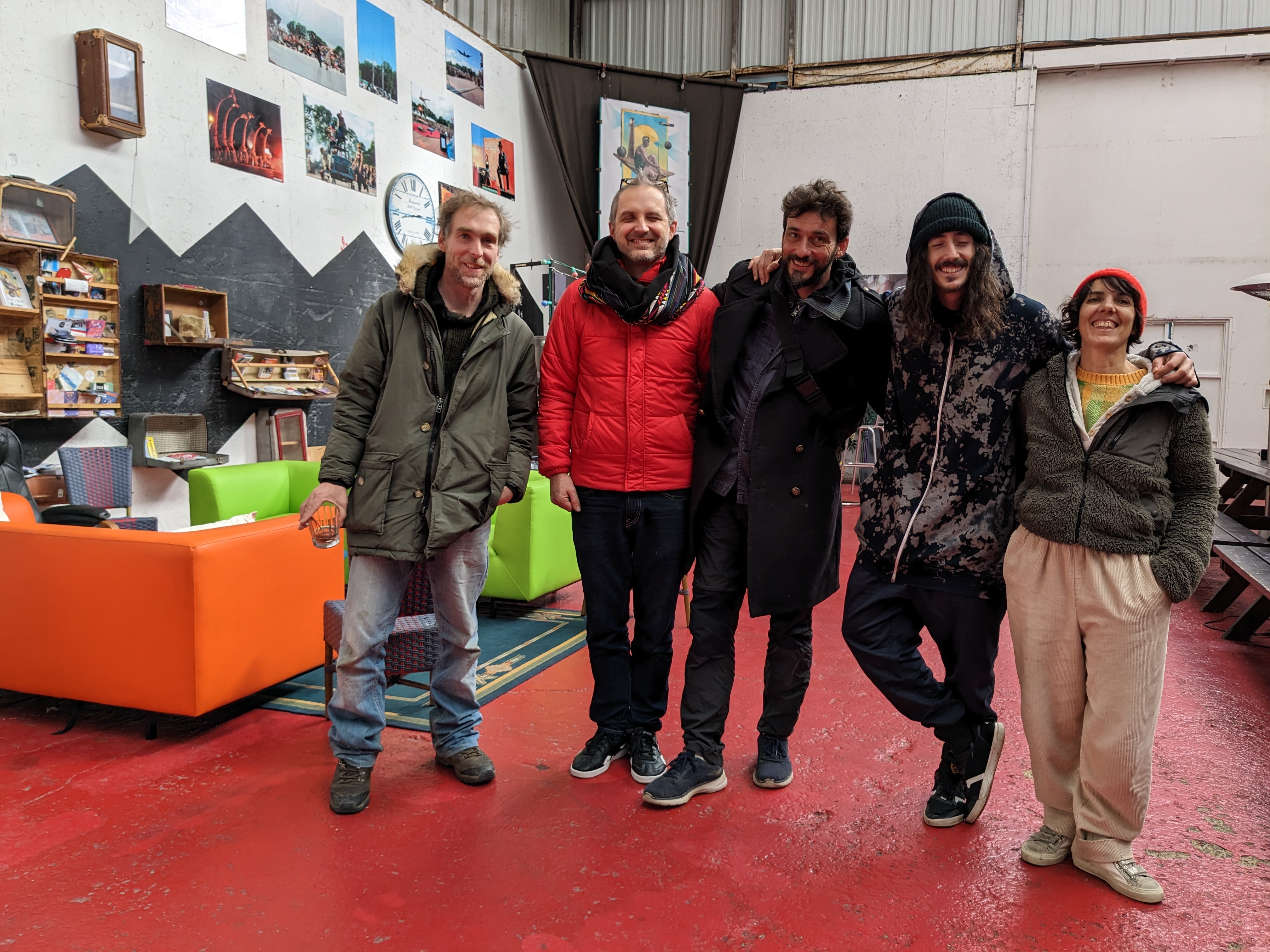 De gauche à droite, Julien Corda (créateur sonore), Victor Belin (multi-instrumentiste), Arthur Ribo (beau parleur et directeur artistique), Simon Nogueira (freerunner) et Crinne Cella (metteuse en scène et dramaturge) composent l’équipe artistique autour de L’Assemblée.