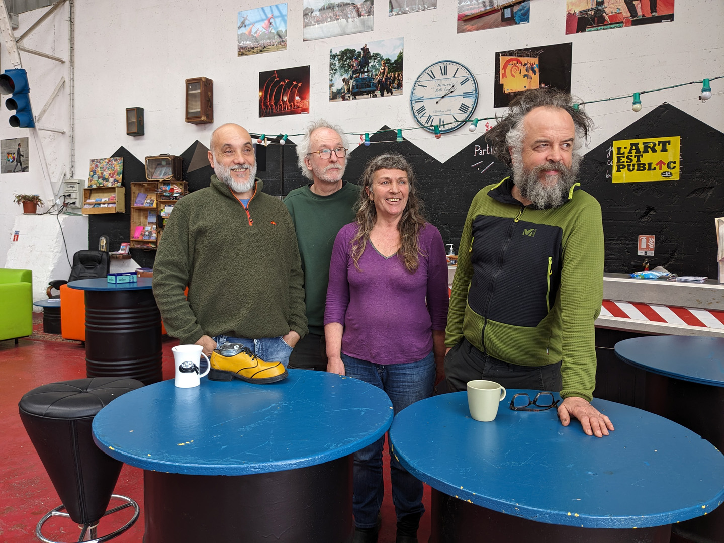 De gauche à droite : Vincent Cros (dramaturgie et écriture), Emmanuel Bourgeau (idée originale, mise en scène, construction, dramaturgie, jeu), Isabelle L’Helgoualc’h (direction d’acteurs et jeu), Sylvain Praud (dramaturgie et jeu)