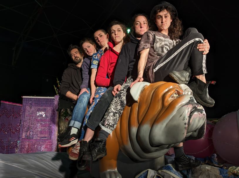Bien qu’arrivée mardi, il aura fallu deux jours pour réunir l’équipe et former ce bel éventail sur le bouledogue mécanique, l’un des accessoires emblématiques de VIOLENT. De gauche à droite, Loïc Chauloux (lumière et régie générale), Aleth Depeyre (lumière et régie générale), Elsa Pottier (réalisation de costumes et accessoiriste), Camille Urvoy (régie son), Nanda Suc et Aude Martos (directrices artistiques et interprètes) ne le laissent pas paraître mais sont heureux·ses d’être au Fourneau pour affiner la création de VIOLENT. Car oui, la première représentation approche... et elle aura lieu non loin d’ici dans le cadre du Printemps des Abers, à Le Drennec le samedi 13 mai précisément.