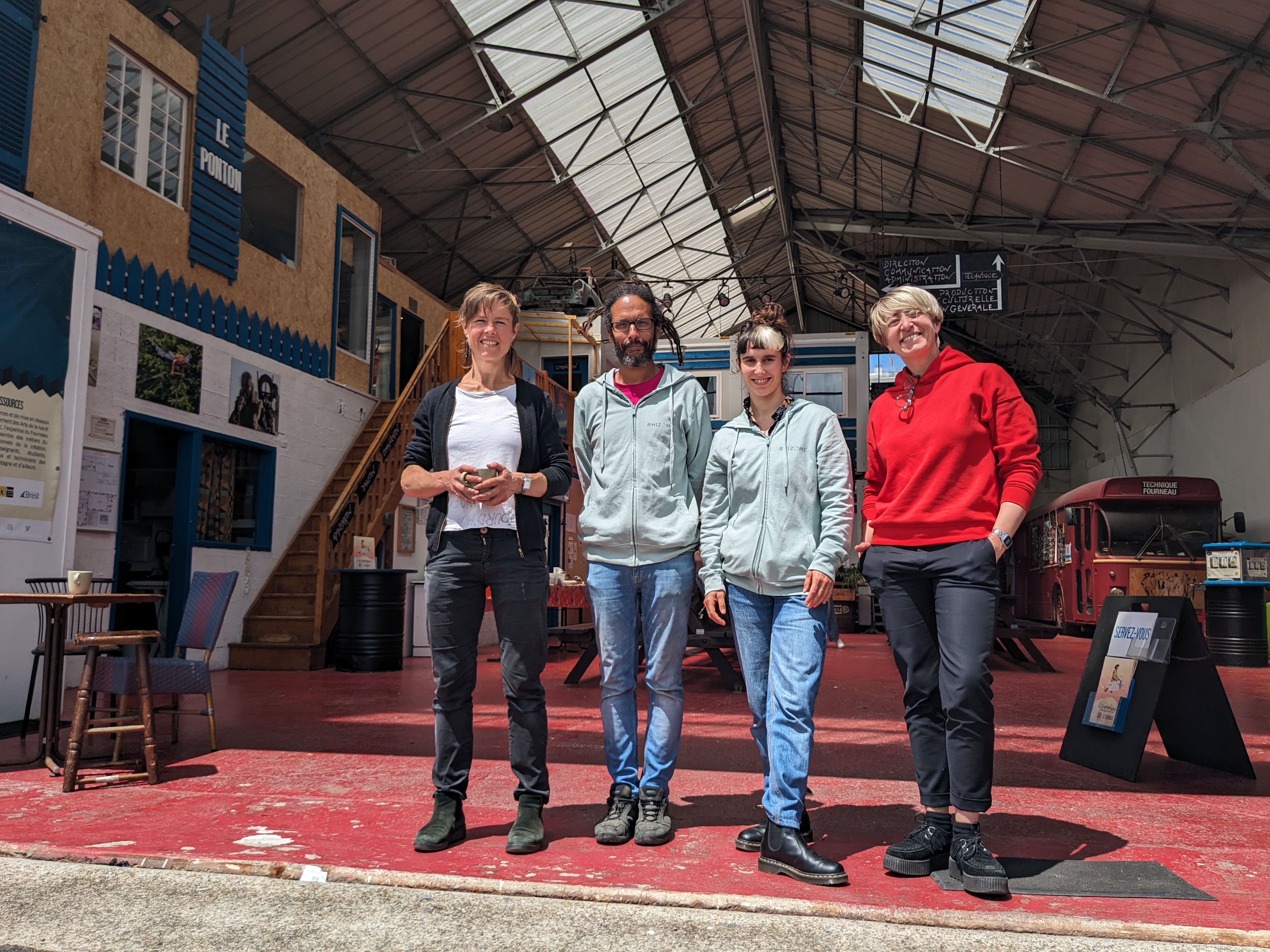 De gauche à droite : Chloé Moglia (directrice artistique), Haroun Chehata (régisseur), Mélusine Lavinet-Drouet (suspension), Marielle Chatain (création musicale)