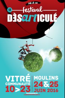 Le festival DésARTiculé, ancré à Moulins (le petit Moulins dans le « 35 ») vous invite en 2016 sa 12e édition sur Vitré Communauté. Ce festival est porté par une association de bénévoles et construit un événement communautaire et itinérant en milieu rural. L’association « Rue des Arts » aspire aujourd’hui à sa professionnalisation et travaille d’arrache-pied à la création d’un lieu de résidence pour s’engager davantage dans son soutien à la création artistique ! Pour que les artistes et crieurs occupent, encore et toujours, les places des villes et des villages !