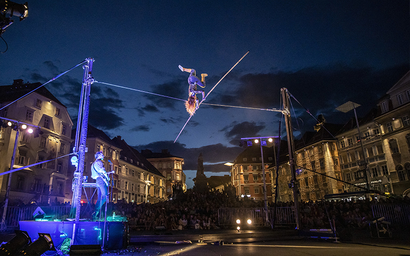 Johanne Humblet se définit comme une « filambule », ne sachant choisir entre sa pratique du fil et du funambulisme. Sa démarche artistique recherche le dépassement de soi. Dans Résiste, cette filambule évolue sur un fil à grande hauteur mais le fil est instable. Une musicienne, qui peut être un musicien, ne peut pas tomber. Chacun résiste à sa façon dans une lutte absurde comme cri de liberté. Une performance multiple qui coupe le souffle.